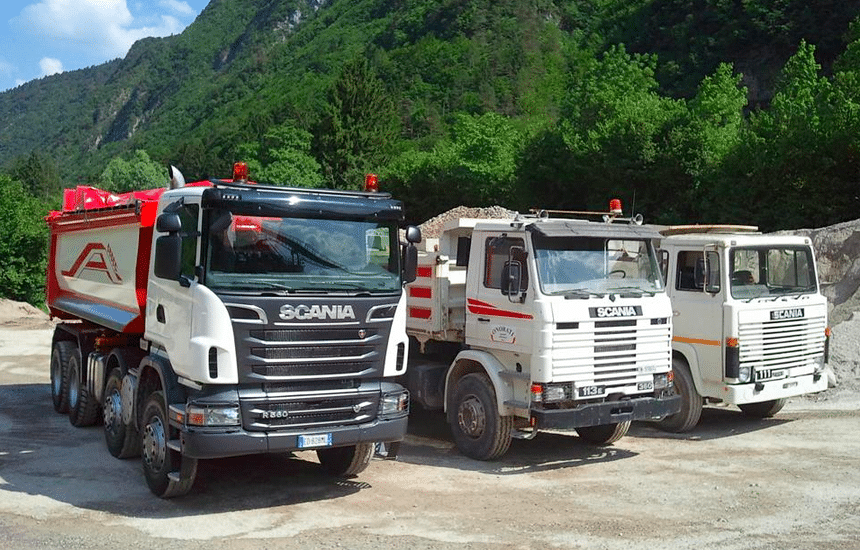 Ces deux images en témoignent avec tout d’abord trois générations de Scania au travail en Italie. Le plus ancien, à droite, est un LB111 6×4, modèle apparu en 1976 ; le second un R113 6×4, modèle apparu en 1988 ; et le dernier un R 8×4, beaucoup plus récent.