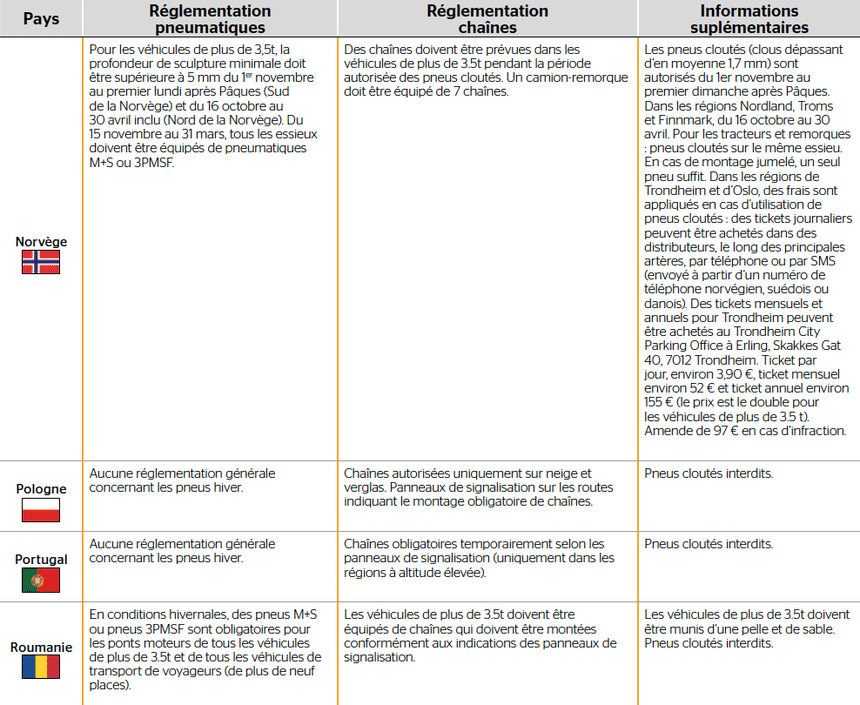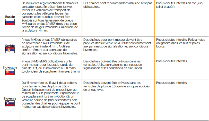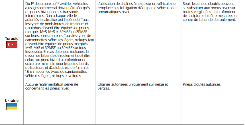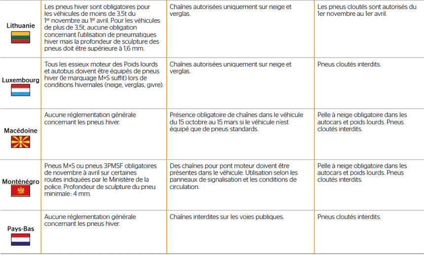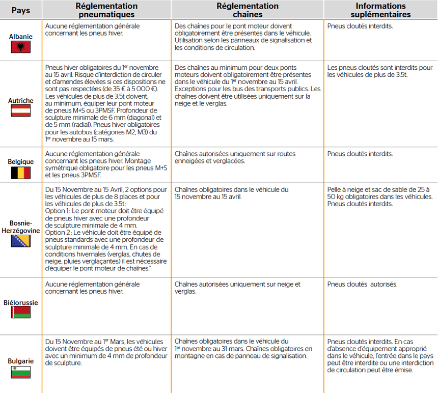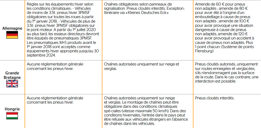 Tableau de la réglementation pneu hiver par pays
