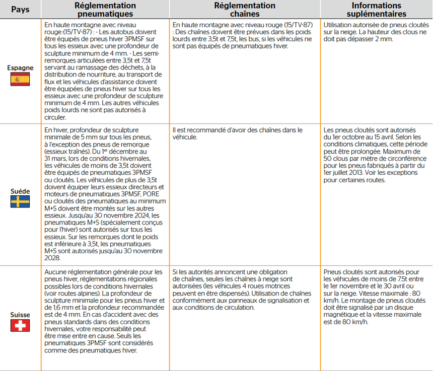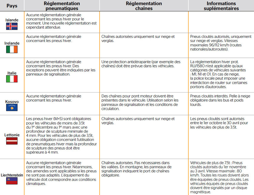 Veuillez vous adresser aux services de circulation routière des pays concernés pour obtenir les règles spécifiques applicables aux chaînes et aux pneus cloutés.