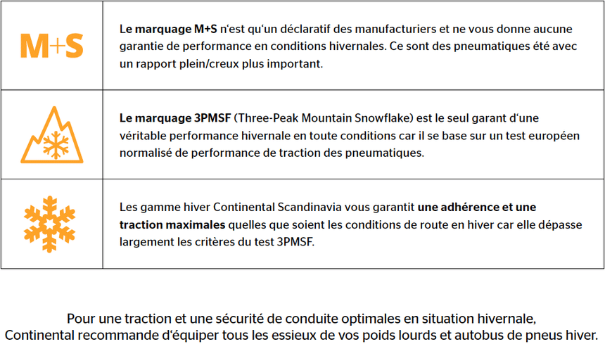Pour conduire en toute sécurité avec une traction optimale (même sur routes mouillées ou verglacées) et pour un bon fonctionnement des systèmes de sécurité actifs et passifs des véhicules, Continental conseille d’équiper les poids lourds, autocars et autobus de pneus hiver sur les essieux directeurs et moteurs pendant la saison hivernale. Deux labels caractérisent les pneumatiques hiver.