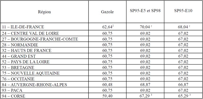 3– Ce taux de TICPE inclut la réfaction de 1€/hl qui s’applique aux supercarburants 95-E5, 98 et 95-E10 destinés à être utilisés sur le territoire corse, conformément à l’article 265 quinquies du code des douanes.