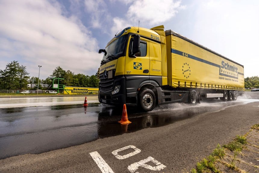 « Seul notre ABA 5 peut le faire », traduit Martin, formateur de Mercedes-Benz TruckTrainer, qui s’est déployé en juin sur le centre de formation du mythique circuit allemand du Nürburgring. Celui-ci n’héberge pas seulement un événement de courses de camions géant, du 13 au 16 juillet prochains (cliquez sur ce lien pour en savoir plus), il abrite également un centre de sécurité routière.