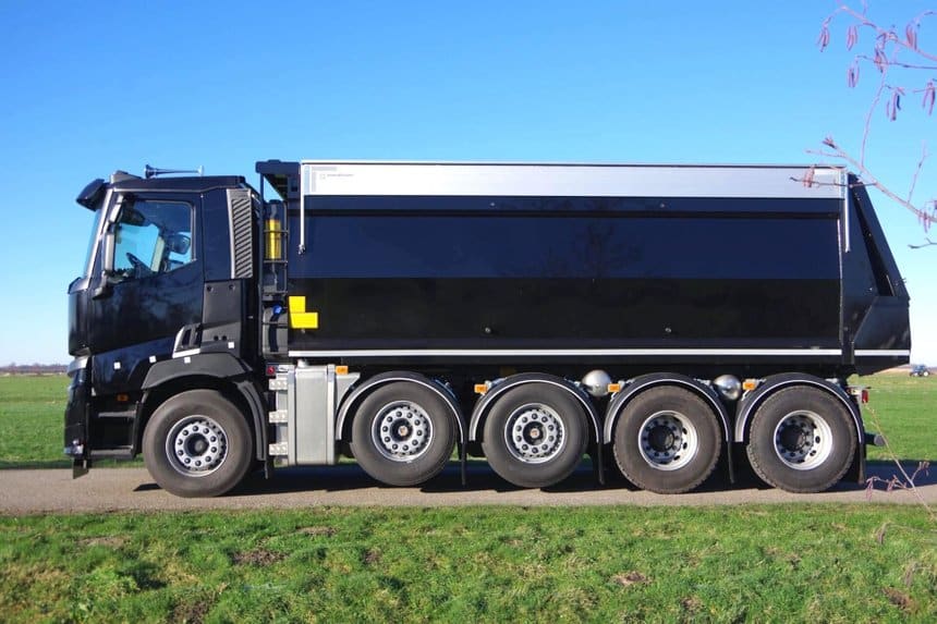 Comme Veldhuizen qui après avoir travaillé sur des bases Mercedes, Scania et Volvo vient de livrer ses deux premiers Renault 10×4 compacts. On notera qu’à la différence des précédents Quadro, ceux réalisés à partir de Renault C 8×4 disposent d’un essieu additionnel monté dans l’empattement (4,55 m), entre le 2e essieu directeur avant et le tandem moteur.