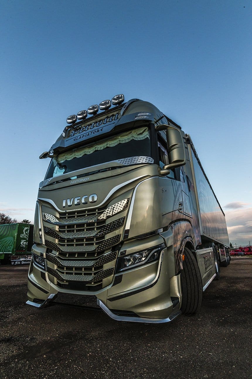 C’est sans doute l’un des premiers Iveco S-Way préparés. Le Gladiator des transports Perrotti (Italie) souligne la ligne agressive du nouveau tracteur italien et met en avant les possibilités qu’elle offre aux amateurs de tuning et autres camions décorés.