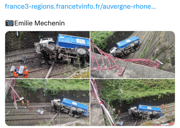 Les spectaculaires images du camion-benne tombé sur la voie ferrée à #SaintChamond #Loire. Le trafic #SNCF est à l’arrêt, l’électricité a été coupée. https://t.co/hiC65ClU4j?Emilie Mechenin pic.twitter.com/iwIzSbzbXF— France 3 Rhône-Alpes (@F3Rhone_Alpes) June 2, 2022