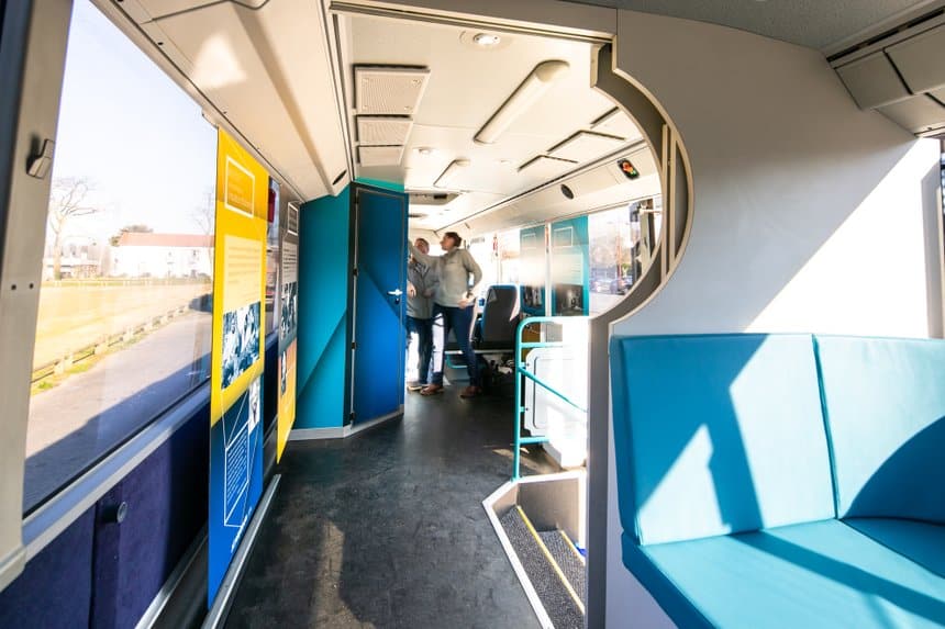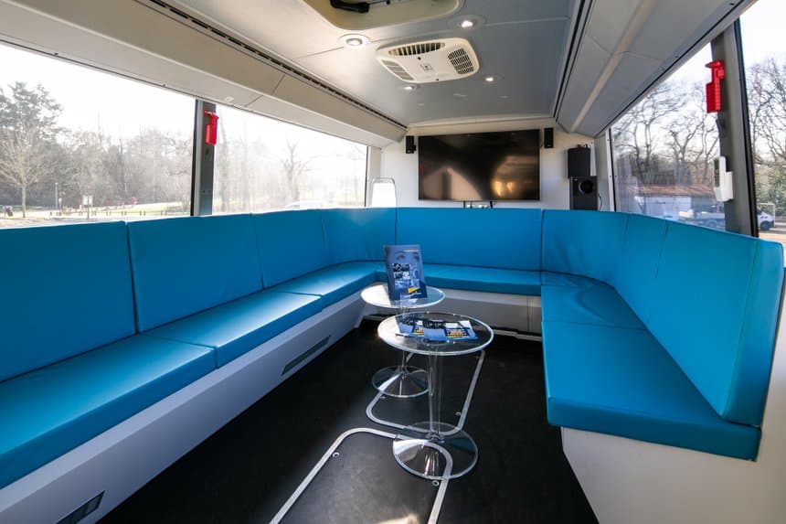 Il est ensuite passé par un atelier de carrosserie pour les aménagements suivants : suppressions des sièges passagers, renouvellement du plancher, Installation de toilettes, installation des supports écran, installation d’un groupe électrogène et des équipements électriques intérieurs, peintures intérieures, installation de 3 tables et 12 fauteuils en carré, réalisation d’une grande banquette d’accueil, installation d’une paroi coulissante entre l’avant et l’arrière du véhicule, ainsi que la mise aux normes PMR. Toutes ses modifications ont nécessité huit mois de travail.