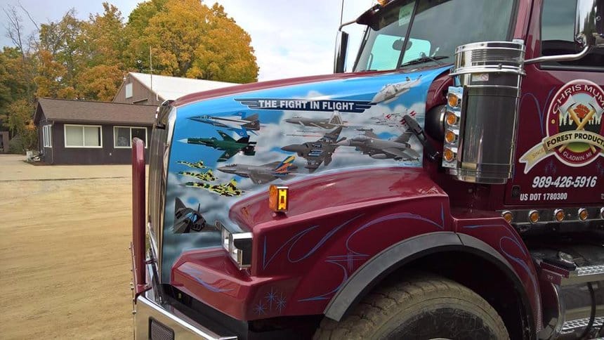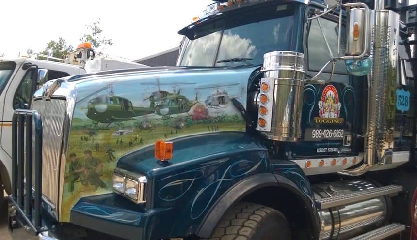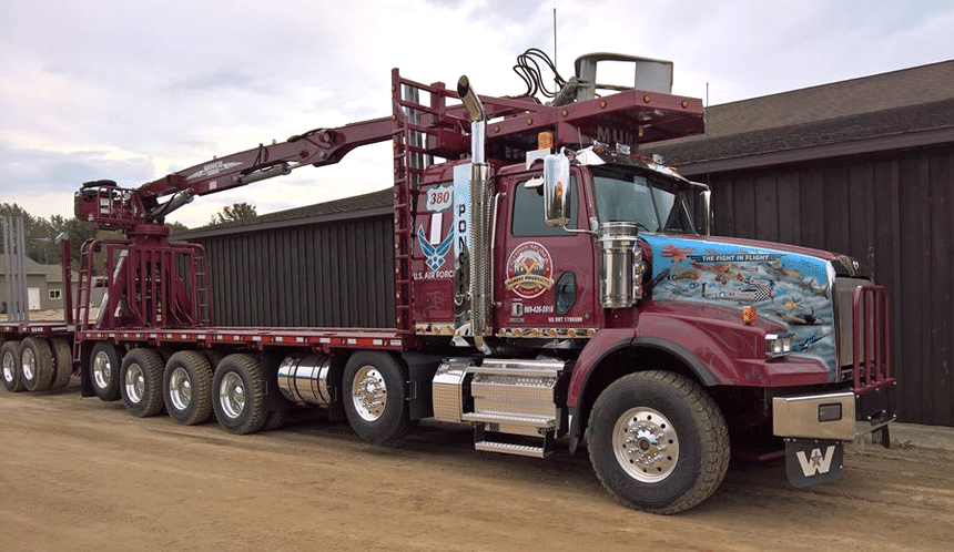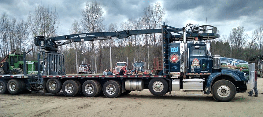Aux États-Unis, les grandes forêts du nord du Michigan font l’objet d’une intense activité forestière et l’on y trouve de nombreux camions grumiers. S’agissant presque exclusivement de bois coupés, les modèles les plus employés sont des porteurs-remorqueurs, équipés d’une grue leur permettant d’être autonome au chargement comme au déchargement. Celle-ci est toujours montée à l’arrière du porteur afin de pouvoir aussi desservir la remorque.