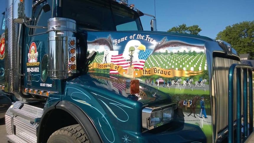 Reste que ces « gros » camions sont généralement d’une apparence très soignée, certains arborant même, comme ces Western Star, des décorations figuratives. Apposées sur les flancs du capot, elles retiennent ici des thèmes patriotiques, classiques dans le pays.