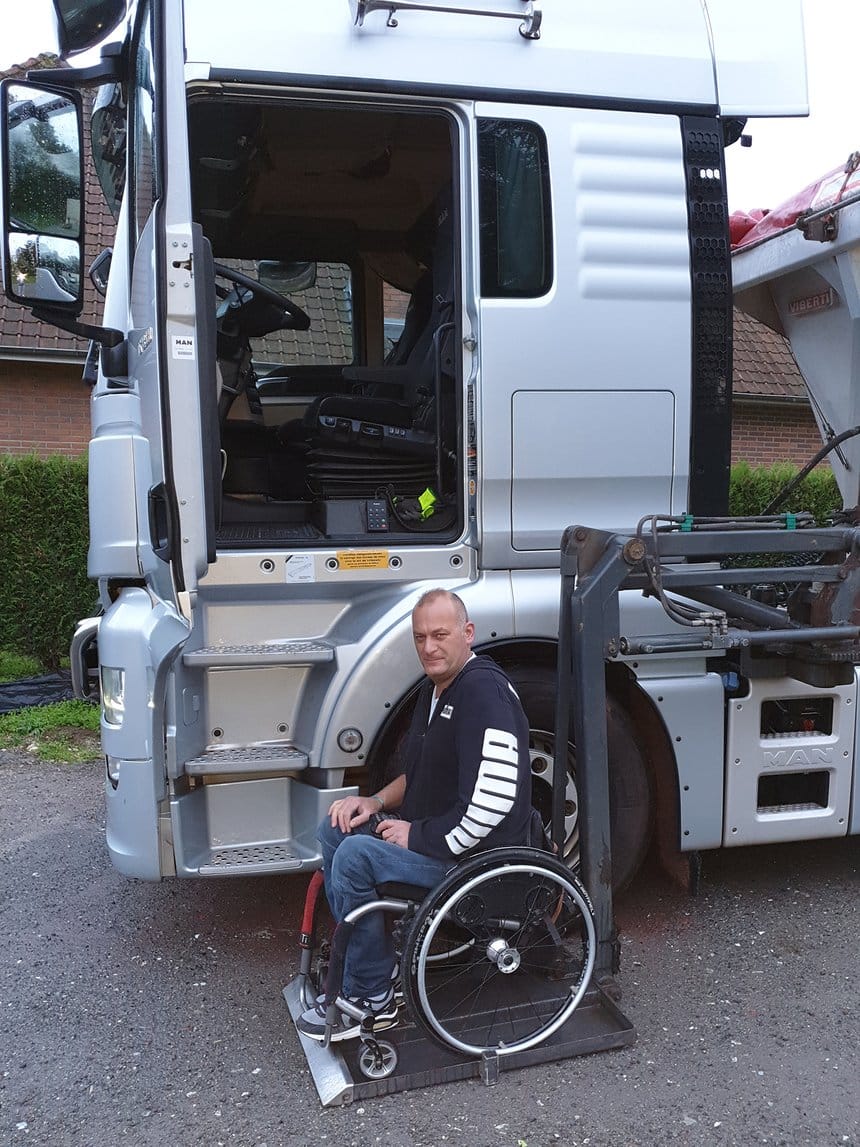 « Grâce à MAN qui m’a soutenu pendant la création de l’entreprise, j’ai pu mener à bien mon projet, ajoute Guillaume. Aujourd’hui mon tracteur TGX 580 est équipé d’une plateforme élévatrice qui me permet d’accéder à la cabine. Toutes les fonctions sont au volant. Je peux donc conduire sans problème. Trois autres MAN en sont également équipés. Je peux changer de véhicule lorsque cela est nécessaire ».