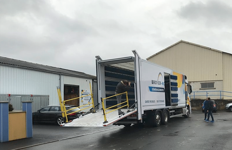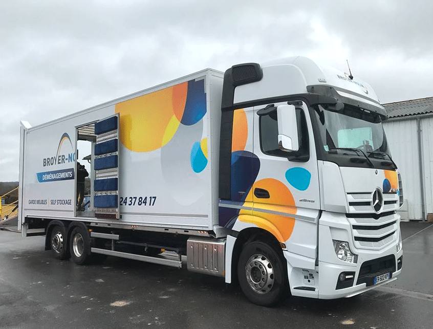 Une performance peu banale mais utile à certaines entreprises comme ici le déménageur ardennais Broyer-Nolin qui a monté cet équipement sur un porteur Mercedes Actros 2545 6×2 à cabine GigaSpace et suspension pneumatique intégrale.