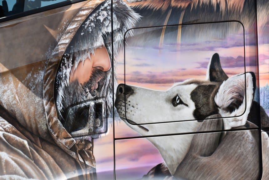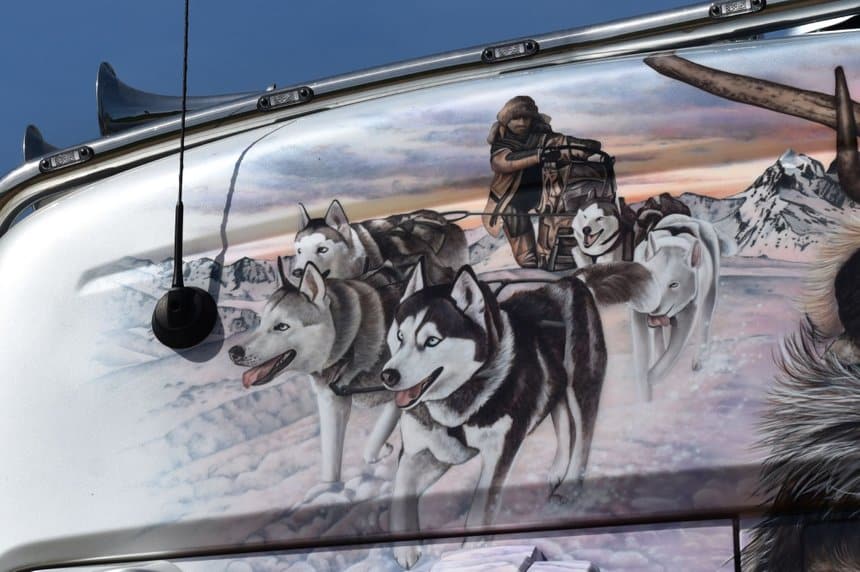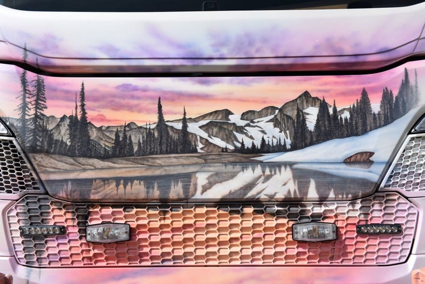 Sans aucun doute l’une des plus belles fresques sur carrosserie qui nous ait été offerte ces dernières années. Les couleurs, dont ce bleu glacier et ce blanc nacré, donnent au projet le droit de rêver aux plus hautes récompenses lorsqu’il participera aux truck shows.