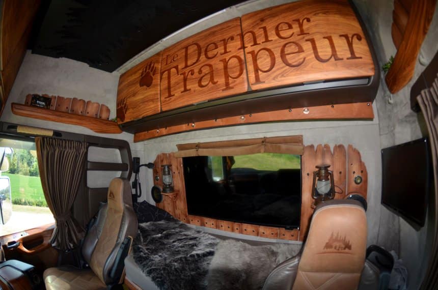 L’intérieur du tracteur fraîchement sorti de peinture est confectionné en un mois et demi par quatre professionnels. Le résultat est incroyable : gravures sur des panneaux en imitation bois, peau de vache sur les contre-portes, écran de 103 cm au-dessus de la couchette, couvre-lit en peau de bête véritable, lanternes vacillantes pour l’ambiance feutrée.