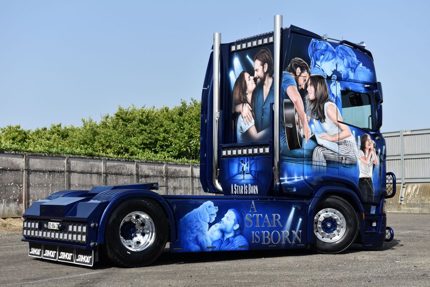 Le camion peut ensuite gagner l’atelier d’Uchaud (Gard) de Lorent, qui va jouer de son aérographe pour pulvériser un subtil mélange de ton sur ton bleu et de portraits multicolores. Des scènes du film américain A Star Is Born, de et avec Bradley Cooper, mais aussi Lady Gaga, sont ainsi peintes sur un fond bleu saphir magnifique, issu du nuancier Scania.