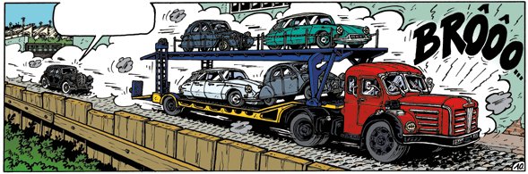 Les dessins évoquent un bon vieux Spirou et fourmillent de détails plutôt bien retranscrits, comme les carrosseries des véhicules mais aussi le siège des transports Bonpain à Montreuil, ou encore le restauroute Relais La Roche sur la N 6. Avec les héros, on plonge dans l’insouscience des années 50-60 avec délectation. Et puis, comme tout est bien qui finit bien, on peut l’offrir à n’importe quel membre de la famille, quel que soit son âge.