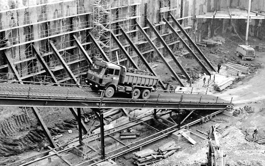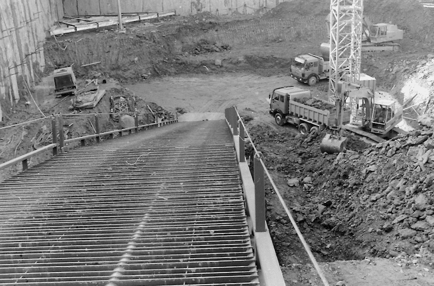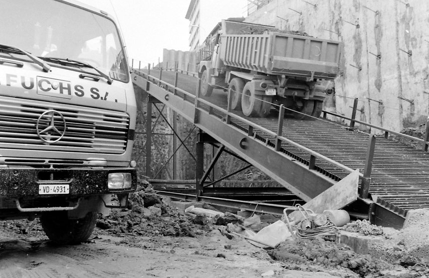 En 1986, à Morges, le chantier Charpentiers-Sud a compté parmi les plus impressionnants menés en Suisse cette année-là. La construction du parking souterrain, dont le dernier niveau se situait à 18 m sous terre, a notamment nécessité la construction d’une rampe métallique que les camions bennes devaient emprunter à vide à la descente et en charge dans l’autre sens.