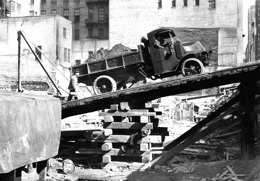 Enfin, souvenir d’un autre temps : nous sommes aux États-Unis, dans les années 1930, le camion est un Mack, à transmission par chaînes, et la rampe est en bois, mais le principe reste le même. Mieux valait qu’il ne pleuve pas parce que les roues à bandage ne brillaient pas spécialement par leur qualité d’adhérence.