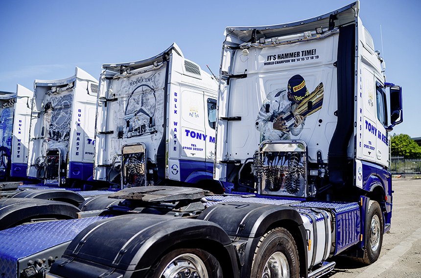 La flotte du transporteur anglais Tony Rees, de Porthcawl, est essentiellement composée de trucks Mercedes-Benz, splendides dans leur robe blanche et bleue. Et les derniers Arocs rentrés par ce mister, grand amateur de F1, le sont encore plus quand on en fait le tour et qu’on découvre la paroi arrière : celle-ci est peinte en hommage au team de F1 de Mercedes, et aux pilotes Lewis Hamilton mais aussi Valtteri Bottas.