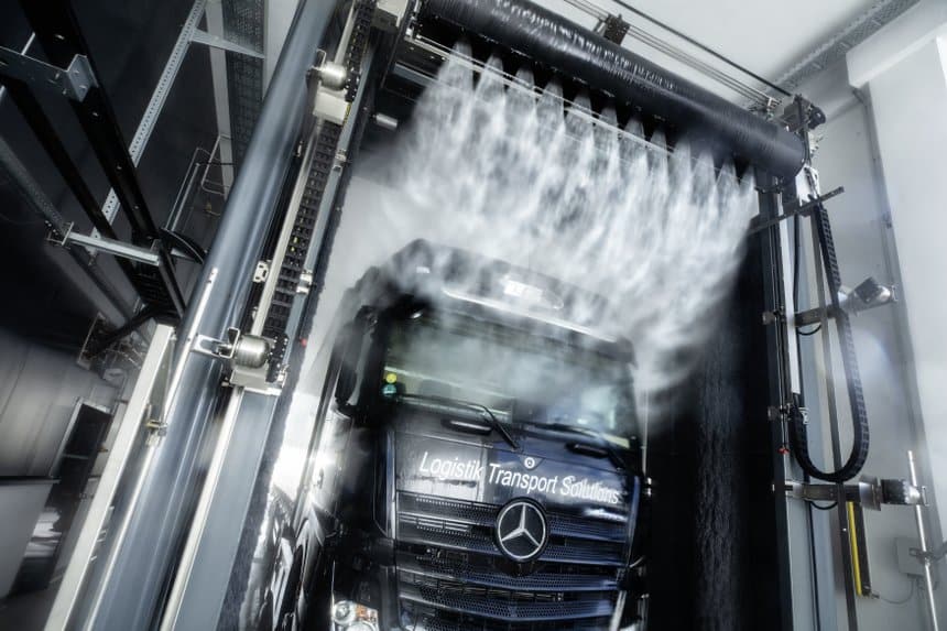 Grosse conso d’eau. Un poids lourd, ça ne consomme pas que du gasoil, du gas ou de l’électricité. Le nettoyage est une opération récurrente, et elle nécessite beaucoup d’eau : 300 l pour un véhicule.