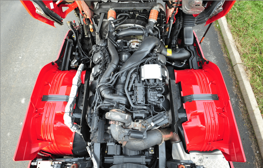 Sous cet angle, cabine basculée, ce qui frappe, c’est la nudité du DS14. Tout est accessible, visible et la principale concession à la modernité semble être ce gros turbo que l’on voit, au premier plan. Sur le DC16 de 2015, le moteur disparaît littéralement sous les conduits, gaines et autres tubulures. Il faut dire que les deux n’évoluent pas dans le même monde : 24,6 ch/l pour le premier, 44,5 ch/l pour le second. La puissance spécifique a augmenté dans l’intervalle d’un facteur 1,8. C’est phénoménal. D’autant que, dans le même temps, la consommation spécifique a suivi la tendance inverse (presque dans les mêmes proportions) et que les émissions, si difficiles à piéger sans dégrader la consommation (et dont personne ne se souciait en 1969), sont désormais toutes éliminées. Ou quasiment. Voilà qui suffit à expliquer l’écart de complexité entre les deux.