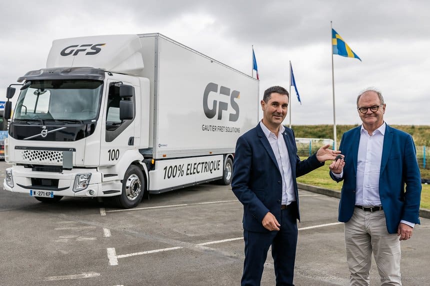 Jean-Yves Gautier, dirigeant de GFS (Gautier Fret Solutions *) a reçu les clés de son premier camion électrique, un Volvo FL Electric doté de batteries de seconde génération. Premier porteur électrique à rouler en Bretagne, il et assurera des missions de distribution urbaine dans la métropole de Rennes et plus largement dans toute la Bretagne.