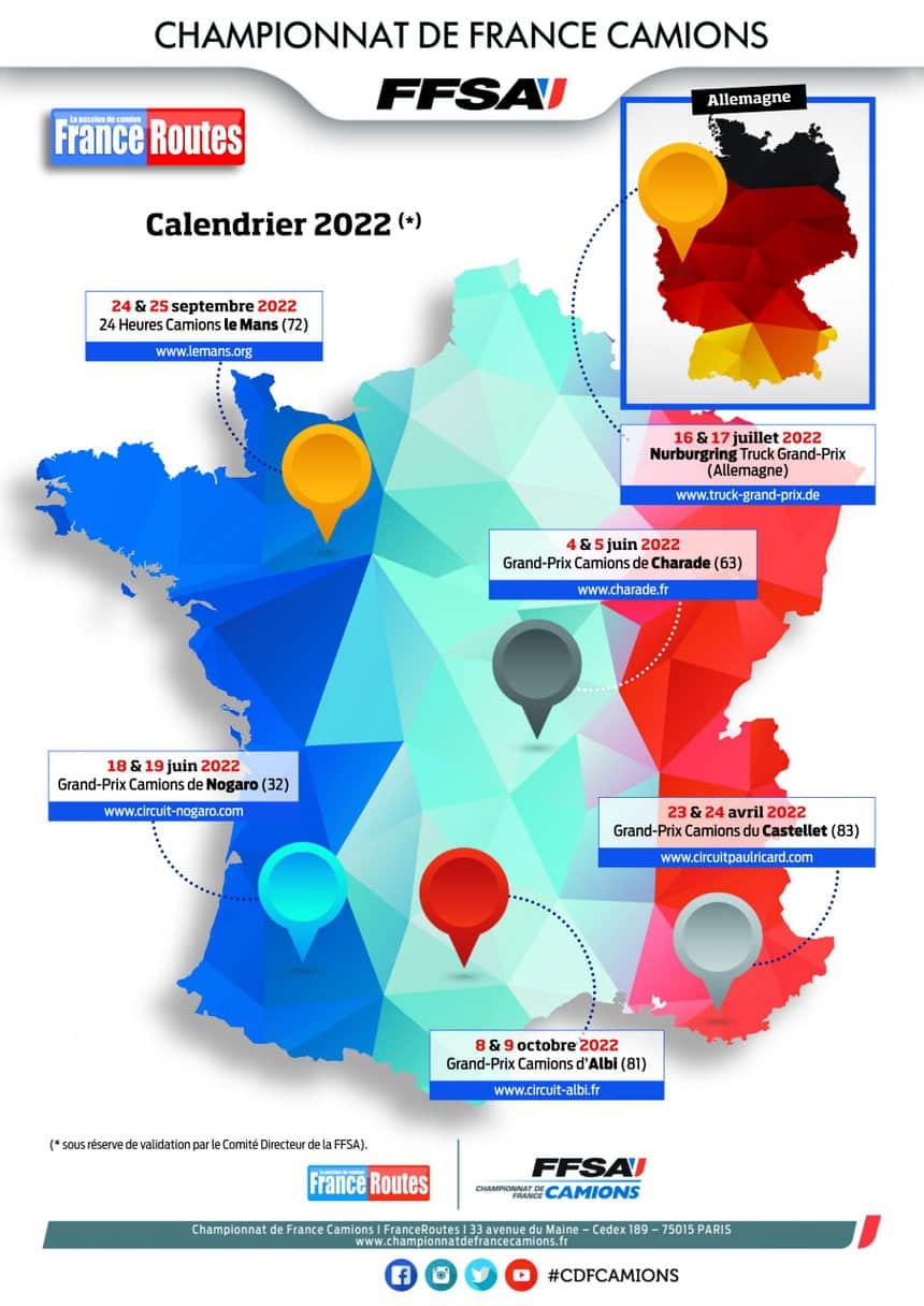 Après une saison 2020-2021 atypique, France Routes, promoteur du Championnat de France Camions FFSA, est heureux de vous dévoiler le calendrier 2022. Six rendez-vous sont au programme, dont un Grand Prix en Allemagne !