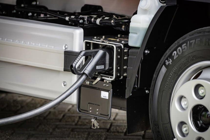 Physiquement, le Fuso eCanter ressemble à ses frères fonctionnant au gazole. Son moteur électrique présente une puissance de 129 kW/175 ch. Ses batteries lithium-ion ont un poids total de 600 kg. Elles sont installées dans l’empattement et lui offrent plus de 100 km d’autonomie.