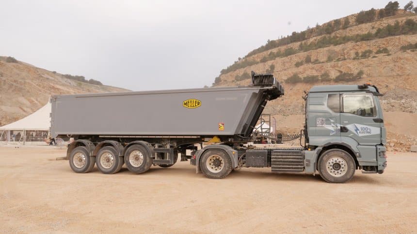 Dans la carrière Jean Lefebvre à Châteauneuf-Les- Martigues (Bouches-du-Rhône), deux configurations étaient présentées, un porteur MAN eTGS 6×2 équipé d’un bras ampli-roll et d’une benne Decker ; et un tracteur eTGS 4×2 attelé à une remorque benne Meiller chargée à 10 t de gravats.