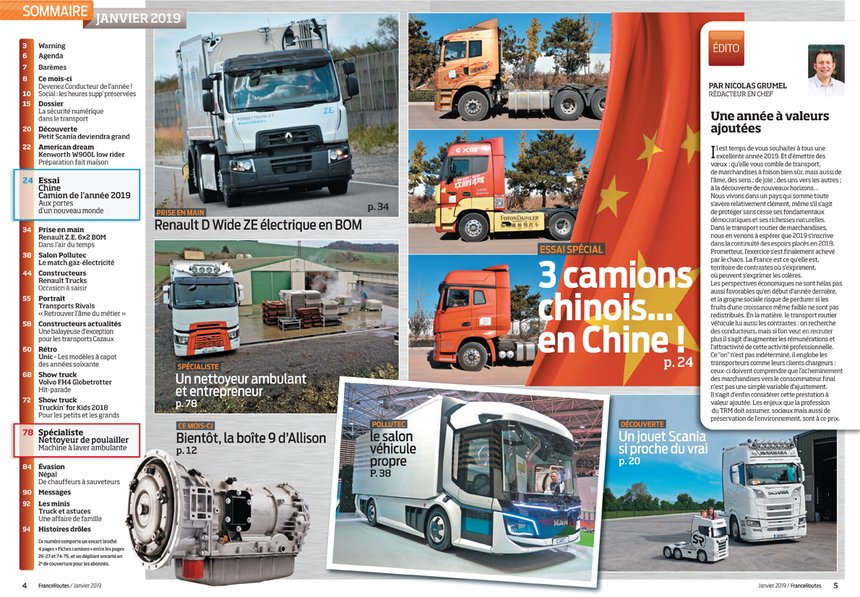 - Un essai exclusif comme seul FranceRoutes peut vous en proposer : celui des trois camions chinois de l’année 2019, les tracteurs Faw J7 Jiefang, Foton Daimler Auman Est A et Camc Hanma H7. Notre essayeur vedette, Fabien Calvet, a été convié à les conduire sur les routes de l’Empire du milieu, et il en est revenu avec un reportage exceptionnel. Ne rigolez pas, certains de ces camions pourraient bientôt débouler sur nos routes…