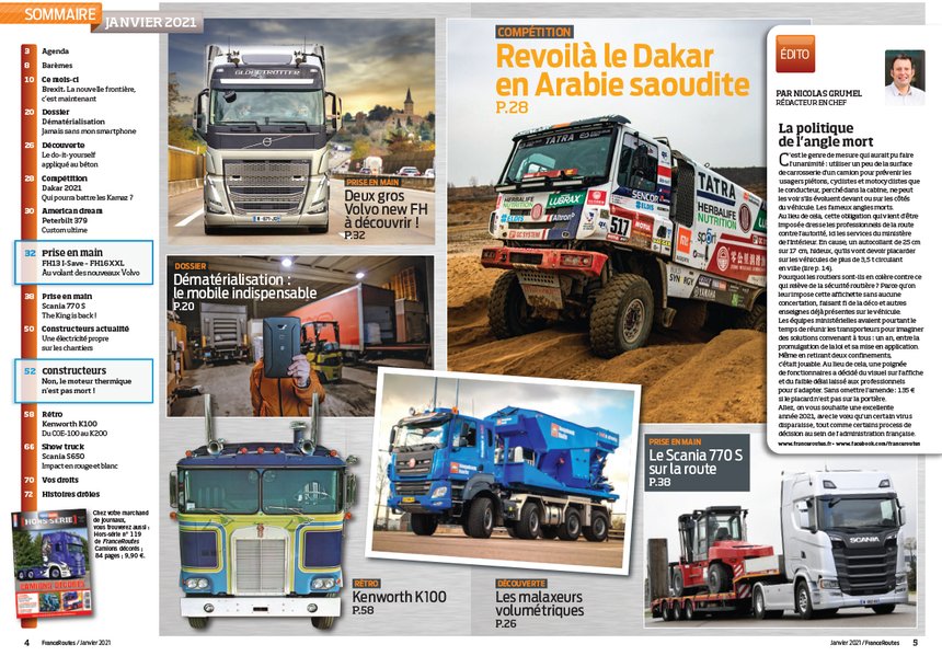 Ce magazine FranceRoutes n°466 (janvier 2021) est riche de nombreux sujets, comme vous pourrez le constater chez votre marchand de journaux ou au rayon presse d’un supermarché ; il est disponible au prix de 5,20 € depuis le lundi 28 décembre.