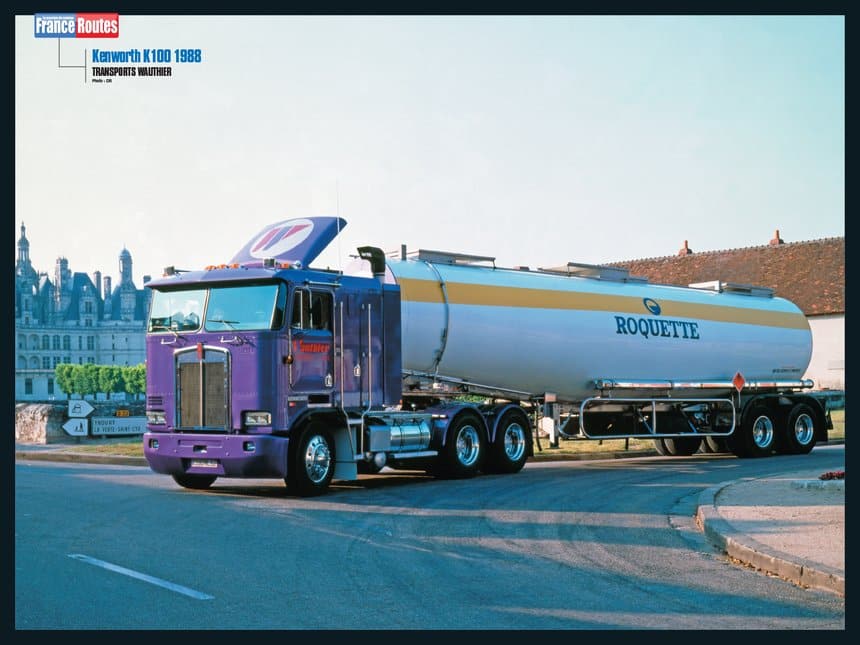 - Sur l’autre face du poster, un Kenworth K100 de 1988 ayant appartenu aux tps Wauthier, illustrant notre sujet Rétro du mois sur le modèle cabover mythique de la firme américaine.
