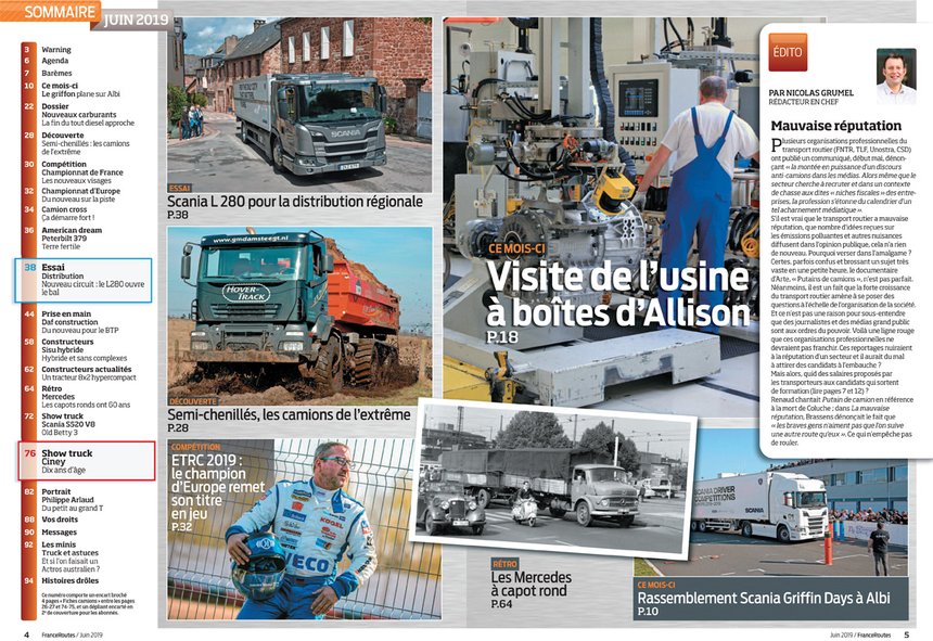 - Autre début de saison, le championnat d’Europe 2019 ETRC de camions de course, présenté dans ce numéro en rubrique Compétition, de même que les nouveaux visages du championnat de France, et la première course de la coupe de France de camion-cross. C’est parti pour plusieurs mois de spectacle sur piste et terre, à retrouver dans les numéros de FranceRoutes à venir !
