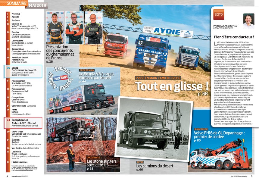 - Autre essai particulier, un comparatif 100 % groupe Paccar entre un Kenworth US et un Daf européen. Quels sont les avantages de ces deux produits issus d’un même groupe ? Quelles différences dans la philosophie de conduite ? Tout cela est décrit dans ce mag’.