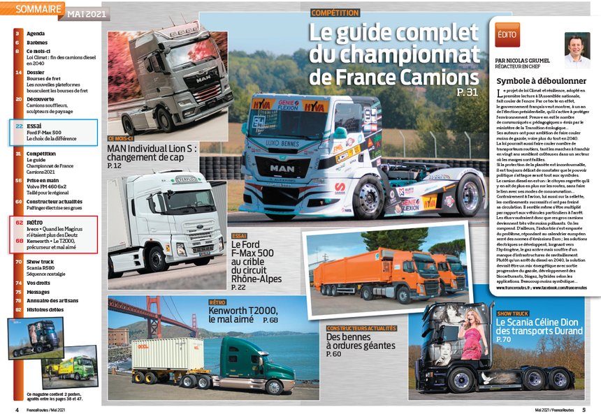 . Ce numéro de juin 2021 contient le Guide du Championnat de France Camions 2021 (coorganisé par FranceRoutes avec la FFSA), le premier GP de l’année, sur le circuit Charade, étant annoncé les 5 et 6/06 (cliquez sur ce lien pour plus d’infos). Présentation des pilotes, des camions de course, d’un week-end de GP, vous trouverez toutes les informations utiles dans ce guide de 15 pages.