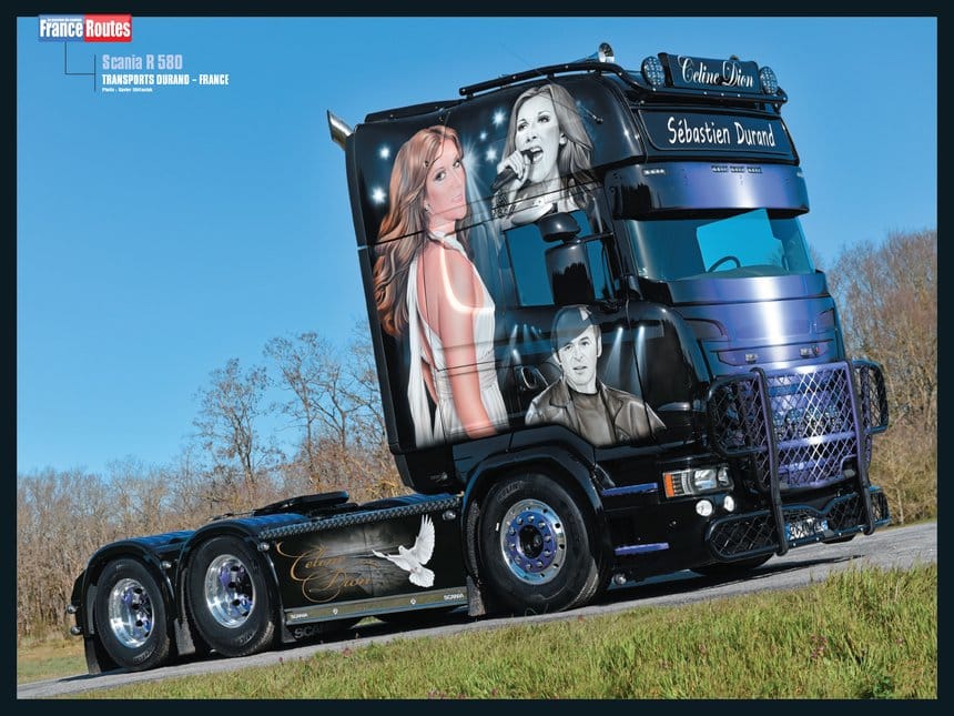 . Autre véhicule magnifique présenté dans ce FranceRoutes, le Scania R 580 des transports Durand dédié à Céline Dion. La peinture signée Lorent, dévoilée dans tous ses détails, est magnifique, et la préparation carrosserie soignée. Du coup nous le publions en poster, en attendant bien sûr de pouvoir l’admirer en vrai lors d’un Truck show FranceRoutes, comme celui des 24H Camions les 25 et 26 septembre prochains.