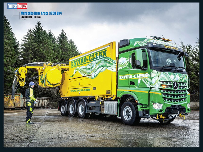 . L’autre face du poster est un camion de travail spectaculaire, un Mercedes-Benz Arocs 3258 8×4 à essieu postérieur directeur, appartenant à l’entreprise écossaise Enviro-Clean. Et dire que ce véhicule est utilisé pour le nettoyage des égouts.