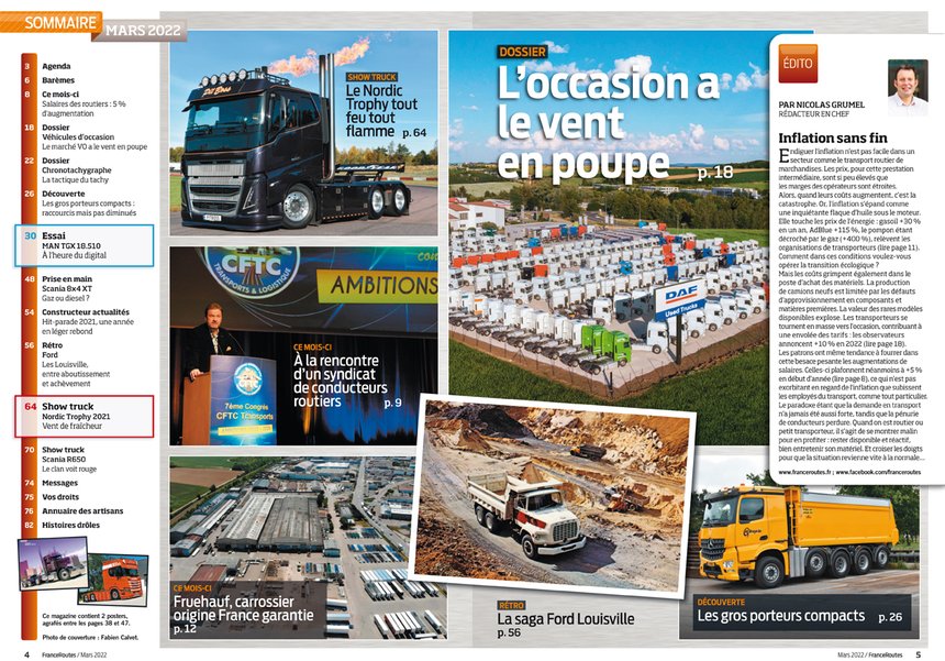 . Vous trouverez dans ce magazine l’essai du MAN TGX 18.510 de nouvelle génération. Fabien Calvet a passé le tracteur au révélateur du circuit Rhône-Alpes de FranceRoutes et en tire de nombreux enseignements, sur son comportement routier avec un équipement électronique et digital avancé, mais aussi sur la consommation de carburant.