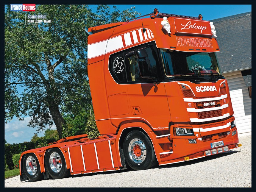 . En rubrique Show truck, Xavier Stéfaniak présente le magnifique tuning en rouge et blanc du Normand Pierre Leloup, sur base de Scania R650 V8. Il est si beau que nous le proposons en poster de ce FranceRoutes :
