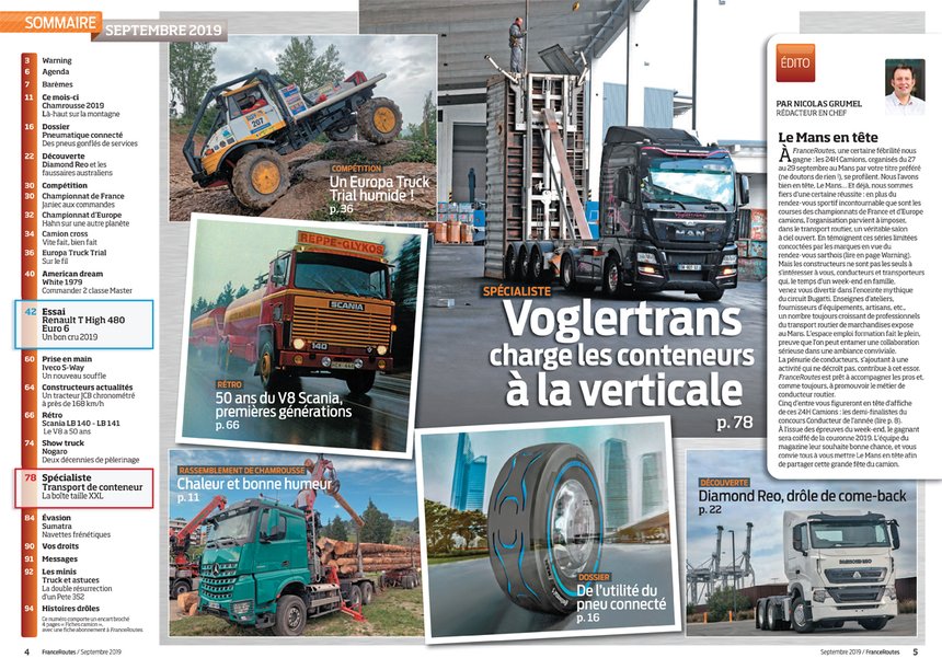 - Plusieurs rassemblements de camions se voient racontés à grand renfort de photos dans ce magazine : le Festi Truck de Nogaro fêtait, fin juin, 20 ans de camions décorés ; la fête des transporteurs de montagne de Chamrousse a survécu à la canicule ; et l’Europa Truck Trial à la pluie et à la boue !