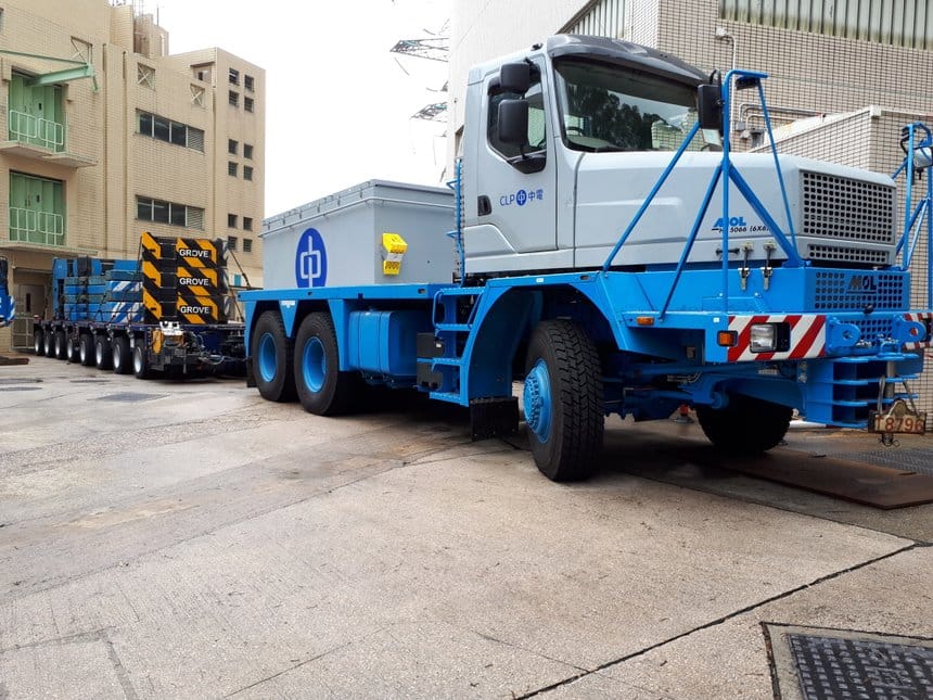 On vous l’avait présenté récemment, voici les premières images « en action » du MOL HF5066 qui vient d’être livré à la compagnie d’électricité CLP de Hong Kong. Il s’agit d’un test de remorquage d’une charge de 214 t sur une pente à 16%. Le tracteur lourd 6×6 de 550 ch du constructeur belge s’en sort sans difficulté, lui qui est capable de tracter jusqu’à 400 t en palier et 230 t sur une rampe à 15 %.