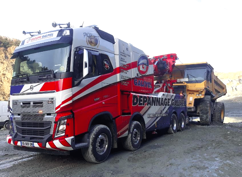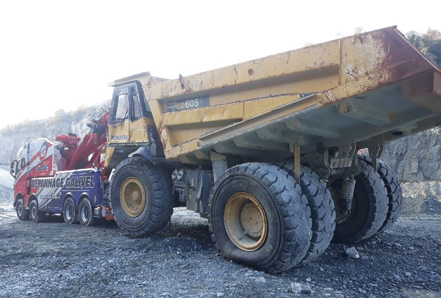 Avec pour commencer un Volvo FH 8×4 du dépanneur breton Galivel que l’on voit ici prendre en charge, sans complexe, un camion (beaucoup) plus gros que lui. En l’occurrence un dumper Komatsu HD605 accidenté. Dans les 46 t à vide, mais surtout dans les 4,6 m de large !