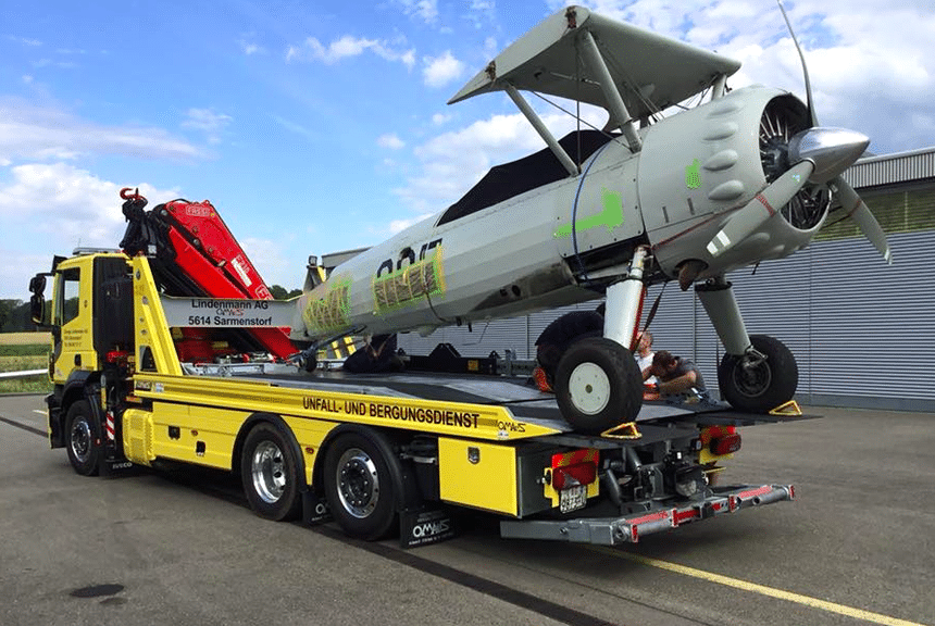 Enfin, deux avions. Le premier est un modèle historique, un Boeing Stearman, accidenté en juillet dernier à l’issu d’un meeting aérien, en Suisse. Heureusement, pas de casse pour le pilote et son passager, mais plusieurs éléments de ce biplan des années 1930, construit essentiellement en bois et en toile, ont été endommagés . C’est donc sur le plateau d’un Iveco du dépanneur suisse Lindenmann que l’appareil a rejoint l’atelier de réparation.