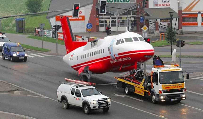 Autre intervention peu conventionnelle pour ce dépanneur tchèque amené à tracter un avion en pleine rue, roulette avant bloquée sur le plateau d’un Daf LF. L’histoire ne dit pas ce qui est arrivé à cet appareil, un Let L-410, fabriqué en République Tchèque, dont les ailes ont été démontées pour l’occasion, ainsi que les turbopropulseurs.
