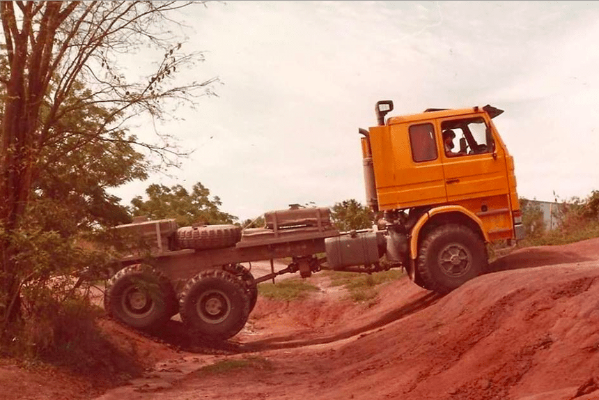 Et puis ça s’arrêtait là. Jamais encore de 6×6 n’avaient été vus ou même évoqués dans cette gamme. Pourtant, ce LT 110 est bien un 6×6 ! D’où sort-il ? De loin. C’est en effet au Brésil, pour concourir sur un marché militaire de tracteurs porte-chars, que Scania, en collaboration avec l’industriel local Engesa, a proposé cette variante 6×6 du LT 110, dont on voit ici un prototype aux essais.