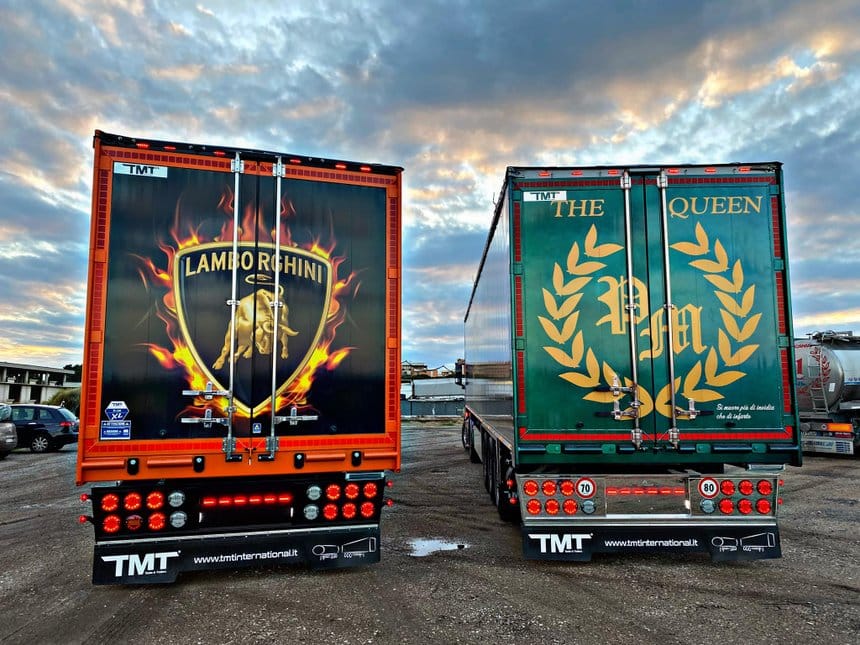 Les deux semi- remorques à fond mouvant fabriquées par le carrossier italien TMT ont aussi reçu les mêmes livrées (en triple couche perlée métallisée de 120 microns d’épaisseur), tout en reprenant des éléments graphiques présents sur les deux S-Way, comme le taureau cabré Lamborghini ou la couronne.