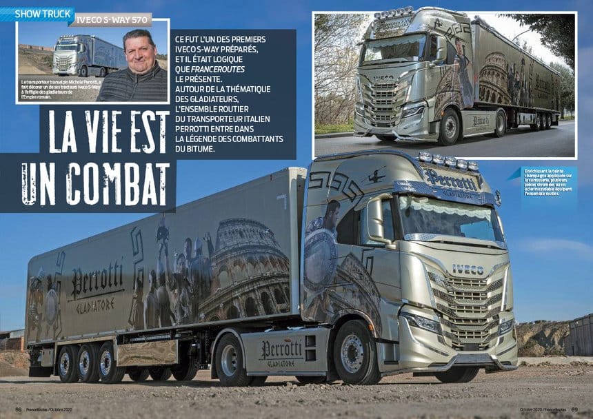 Le précédent ensemble préparé de Perrotti, Gladiator, sur la base d’un tracteur Iveco S-Way 570 lui aussi, a été présenté dans le FranceRoutes n°463 (octobre 2020) ; pour le commander en vente par correspondance, envoyez un mail avec vos coordonnées à : abonnements@info6tm.com