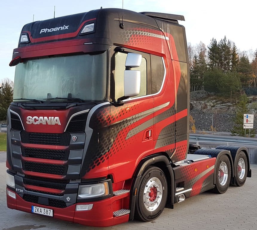A l’entrée du centre d’essai de Scania à Södertälje, en Suède, trône le splendide tracteur Phoenix, un 6×2 à cabine S et moteur V8, bel et bien dénommé S 730.