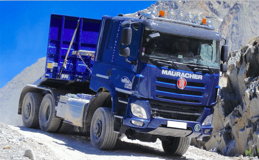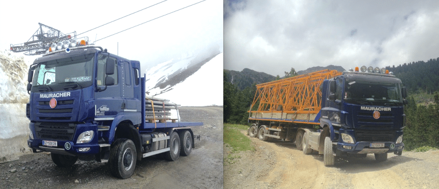 Avec tout d’abord un 6×6 homologué en double genre et exploité par le transporteur autrichien Walter Mauracher qui l’emploie, au gré des besoins, tantôt en porteur à plateau, tantôt en tracteur à sellette. À la différence des 6×6 standard, celui-ci est par ailleurs doté d’un dernier essieu moto-directeur qui a pour effet de réduire le rayon de braquage et d’éliminer le ripage des pneus du tandem, tout en assurant une forte motricité.