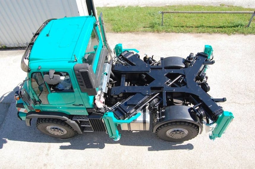 La spécialité de FMG c’est notamment ça : préparer des Unimog en vue de les équiper d’une grue ou d’une nacelle élévatrice. Le châssis spécial FMG et ses stabilisateurs intégrés leurs confèrent une capacité de travail considérablement améliorée.