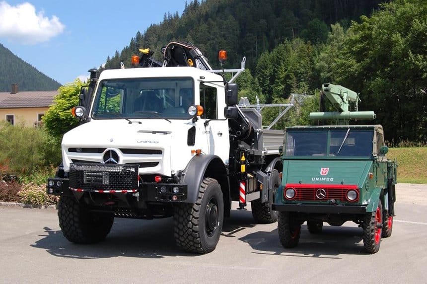 Oui, indiscutablement, mais pour la bonne cause ! Cette photo, prise chez le carrossier autrichien FMG Fahrzeugbau, un spécialiste (notamment) de l’équipement des Unimog, est saisissante par la différence d’échelle qu’elle révèle. On y voit un U401, premier Unimog produit en série à partir de 1953, côtoyer le plus gros modèle actuel, l’imposant U5023. C’est peu dire que les deux ne jouent pas dans la même catégorie. Et pourtant, l’esprit demeure, inchangé : haute mobilité et polyvalence du porte-outils.