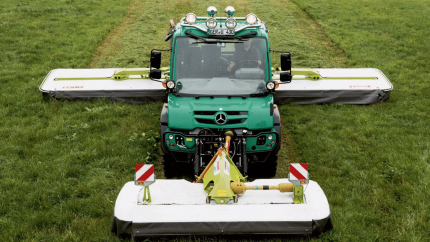 C’est sur la base de l’U 423 que cet Unimog « agricole » a été conçu. Sa cabine en matériau composite anticorrosion, athermique et insonorisant renforcé par des fibres, est agrémentée ici d’un arceau de sécurité « cage » l’entourant totalement. Celle-ci est surmontée des gyrophares obligatoires. Il est propulsé par un bloc moteur de type OM 934, 4 cylindres en ligne de 5,1 l développant une puissance de 231 ch (170 kW). Il dispose par ailleurs des équipements qui ont fait la réputation de ce tout-terrain hors pair : ses ponts portiques, sa transmission intégrale et l’ensemble des prises de force et autres prises de mouvement. Polyvalent, il est aussi à l’aise dans les champs que sur route pour effectuer tout type de travaux (épandage, fenaison, travail du sol, semis ou juste tirer une remorque) ; et ce avec un appétit d’oiseau par rapport à tracteur classique. En moyenne, le U 423 consomme par jour 30 l de gazole de moins, soit une économie mensuelle d’environ 1 350 € sur le poste carburant.